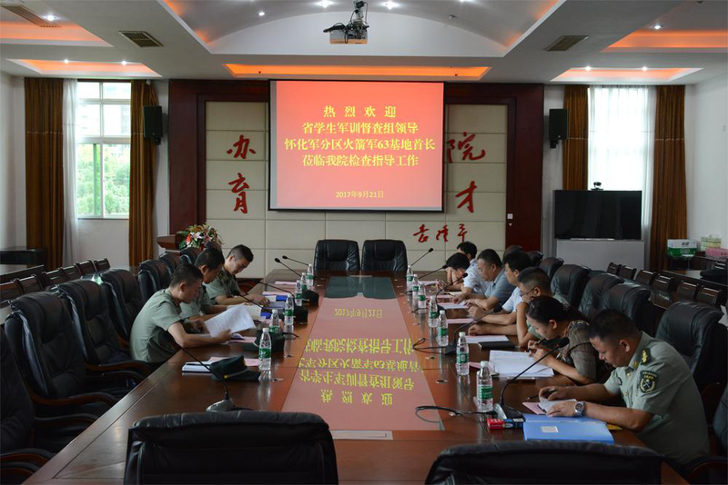 9月22日,省学生军训督查考评组第三组副组长、省学生军训办参谋丁行行、省军区综合训练队教员任超、怀化军分区战备建设处参谋杨帅、火箭军63基地参谋部部队管理处参谋陶园一行来我院督查考核2017级新生军训工作。